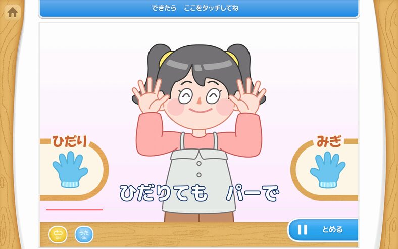 また、「グーチョキパーで なに つくろう」は、手遊び歌になっています。お手本のキャラクターの動きを見ながら、一緒に手を動かして歌ってみましょう。はじめは音楽を聴くだけ、一緒に歌うだけ、手を動かすだけなど、できるところからで構いません。音楽に合わせて体を動かすことで、模倣力、観察力、判断力、対応力を楽しく身に付けることができます。